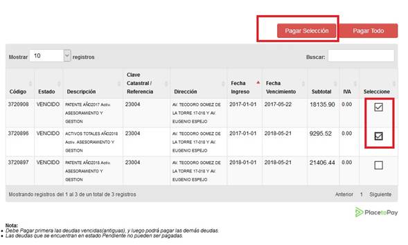 para seleccionar las deudas a ser pagadas.