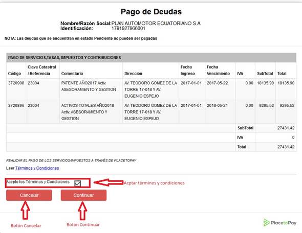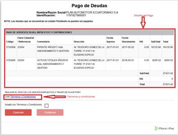 debe aceptar los términos y condiciones para inicia el proceso de pago a