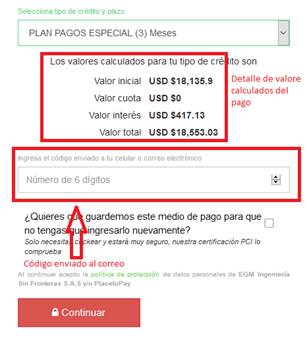 de crédito y a continuación debe ingresar el código enviado al correo electrónico